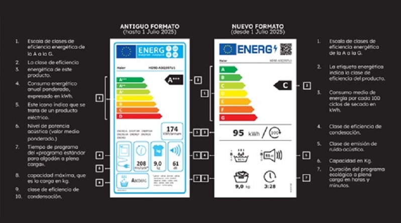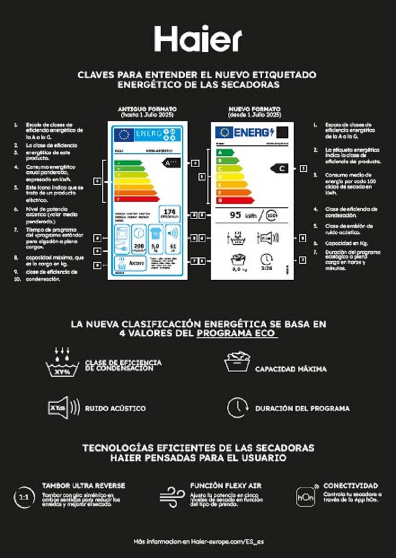 La nueva etiqueta, implementada en secadoras desde julio de 2025, ofrece mayor transparencia y compara mejor los productos actuales, guiando al consumidor hacia opciones verdaderamente más eficientes con un vistazo rápido y un QR para más detalles. Las claves para entender la nueva etiqueta energética según Haier son: