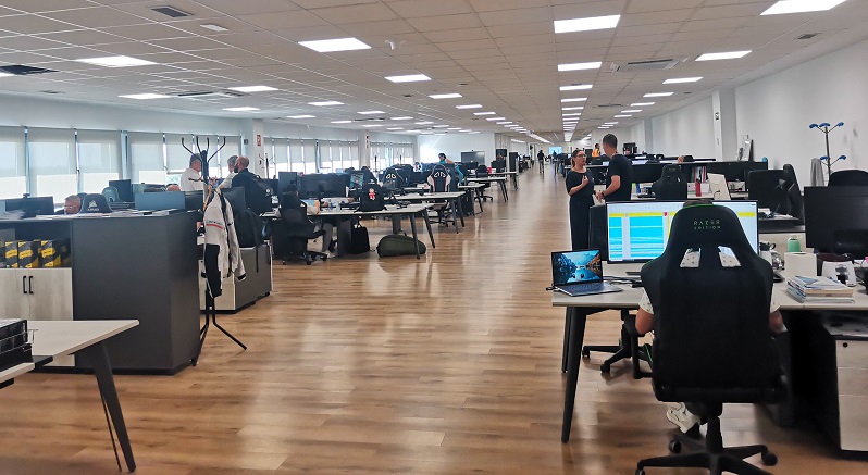 Rafael González, director de Recursos Humanos, hizo de cicerone para enseñarnos las nuevas oficinas, en un espacio totalmente diáfano y donde llamó mucho la atención la calidad de las sillas (todas de gaming y no había dos modelos iguales) y el tamaño de los monitores (eso quien no tuviera dos o tres), en este caso no se aplica el dicho de cuchara de palo en casa del herrero.